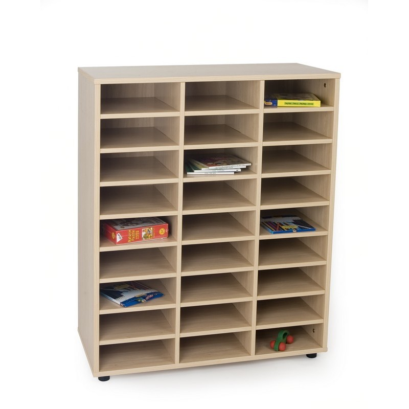 Mueble casillero de 27 casillas, fabricado en melamina de haya de 19 mm de grosor, excepto trasera de 10 mm y cantos de PVC de 2 mm, acabado por las dos caras. Pies niveladores de PVC de 4 cm de diámetro y 4 cm de altura, para evitar la humedad y desniveles que pueda tener el suelo. Estos pies pueden ser retirados para poder superponer diferentes armarios.