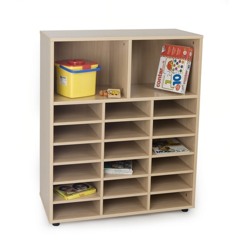 Mueble abierto de 20 casillas, fabricado en melamina de haya de 19 mm de grosor, excepto trasera de 10 mm y cantos de PVC de 2 mm, acabado por las dos caras. Pies niveladores de PVC de 4 cm de diámetro y 4 cm de altura, para evitar la humedad y desniveles que pueda tener el suelo. Estos pies pueden ser retirados para poder superponer diferentes armarios.