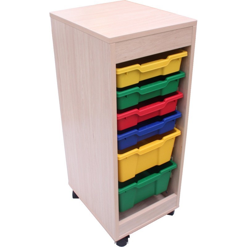 Mueble cubetero de 1 columna con acceso por las dos caras, fabricado en melamina de haya de 19 mm de grosor y cantos de PVC de 2 mm, acabado por las dos caras. Ruedas de 6 cm con freno, para evitar la humedad y poder desplazarlo fácilmente.