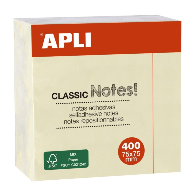 Cubo de 400 hojas de notas adhesivas de 75 x 75 mm en color amarillo estándar. Las notas "Classic" están fabricadas con papel certificado FSC y adhesivo en base agua. Son ideales para dejar tus mensajes en todas las superficies. El adhesivo reposicionable permite pegarlas y despegarlas más de una vez. El tamaño de notas clásico por excelencia ahora en formato cubo para que no te quedes sin notas cuando más las necesitas.