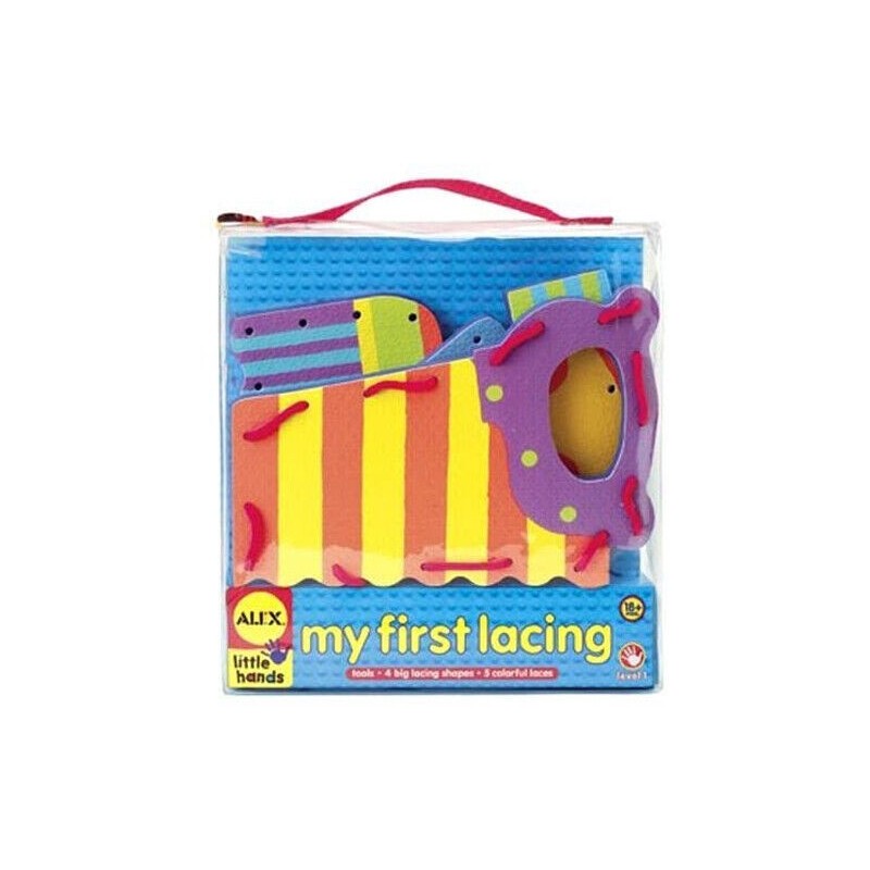 Los cordones a través de agujeros precortados desarrollan la motricidad fina y mejoran la capacidad espacial. Las formas grandes y suaves representan imágenes familiares y es divertido jugar con ellas y manipularlas.