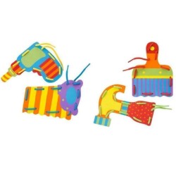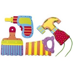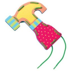 Ensarte cinco cordones de colores a través de cuatro herramientas de goma eva, grandes y resistentes. ¡Gran habilidad preescolar!