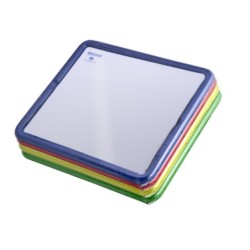 4 pizarras metálicas con marco de plástico de 30 x 26 cm. La cara blanca se utiliza con rotulador, la cara negra con las tizas y ambas caras pueden utilizarse con juegos magnéticos.