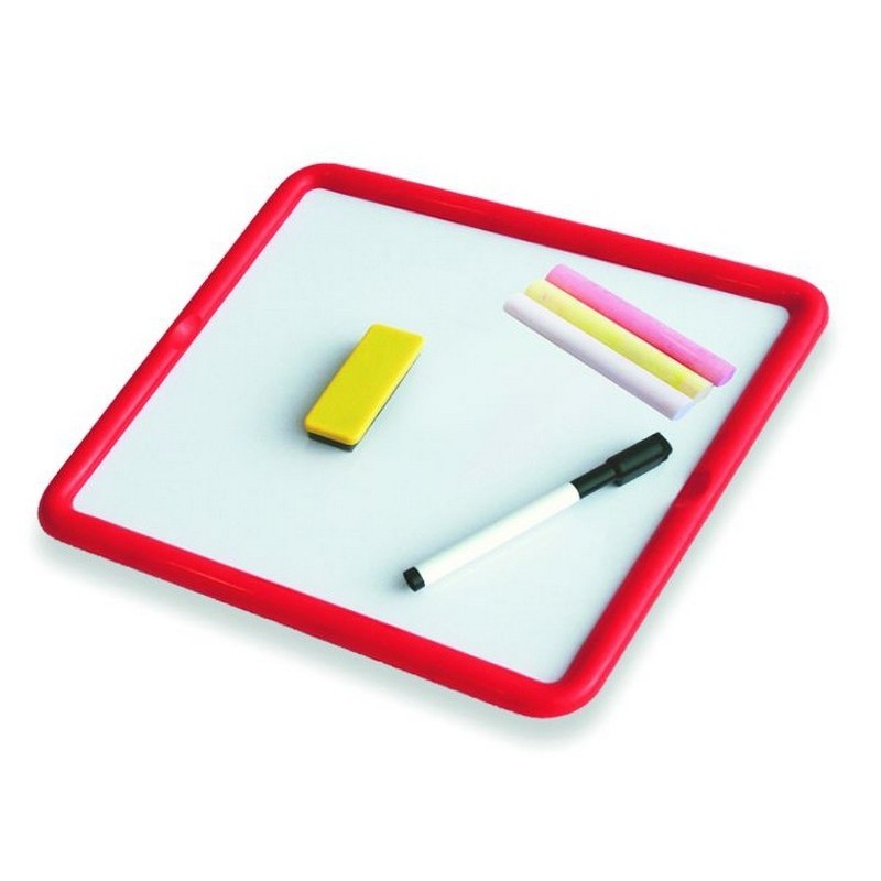Set pizarra metálica de 30 x 26 cm. La cara blanca se utiliza con el rotulador, la cara negra con las tizas. Ambas caras pueden utilizarse con las letras y números magnéticos de nuestra colección.