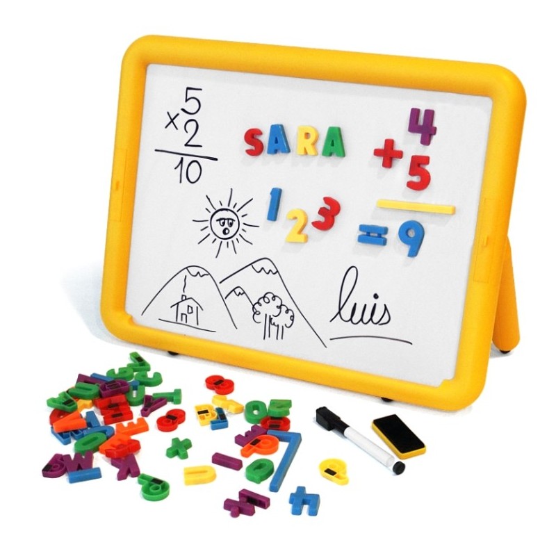 Pizarra de gran tamaño. Permite escribir y dibujar con el rotulador por la parte blanca, o bien hacerlo con tizas por la parte azul. Cualquiera de sus 2 caras pueden utilizarse las letras y números magnéticos. El rotulador se limpia con facilidad mediante el borrador incorporado, o bien con un paño. Para uso horizontal o vertical.