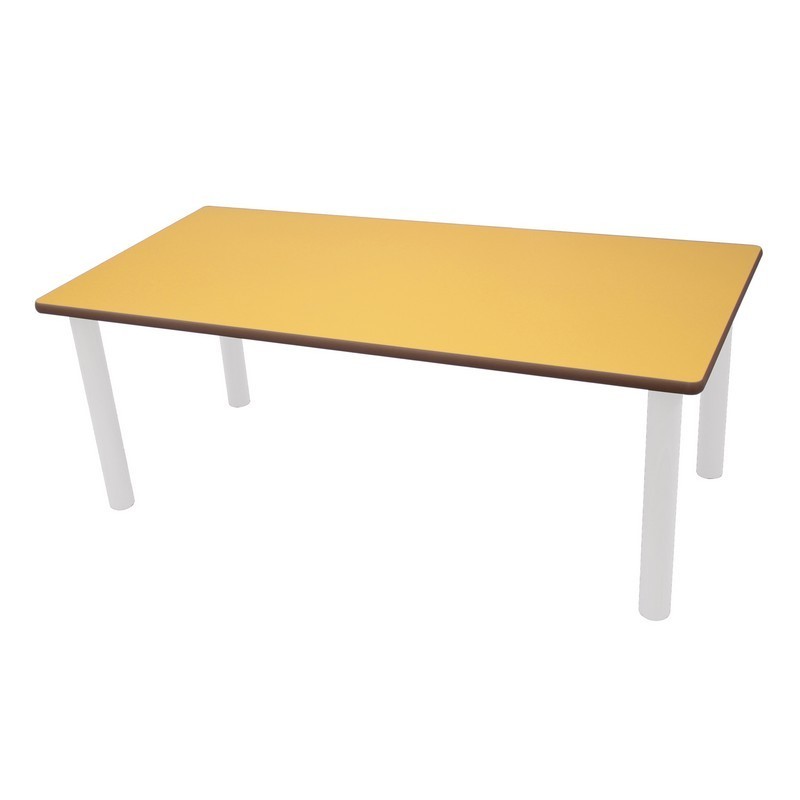 Mesa infantil rectangular, compuesta por cuatro patas de tubo metálico de Ø50 x 1,5 mm con acabado en pintura Epoxi y una tapa tablero MDF laminado de 21 mm de espesor, con cantos redondeados y superficie y contratiro de laminado de alta presión (HPL).