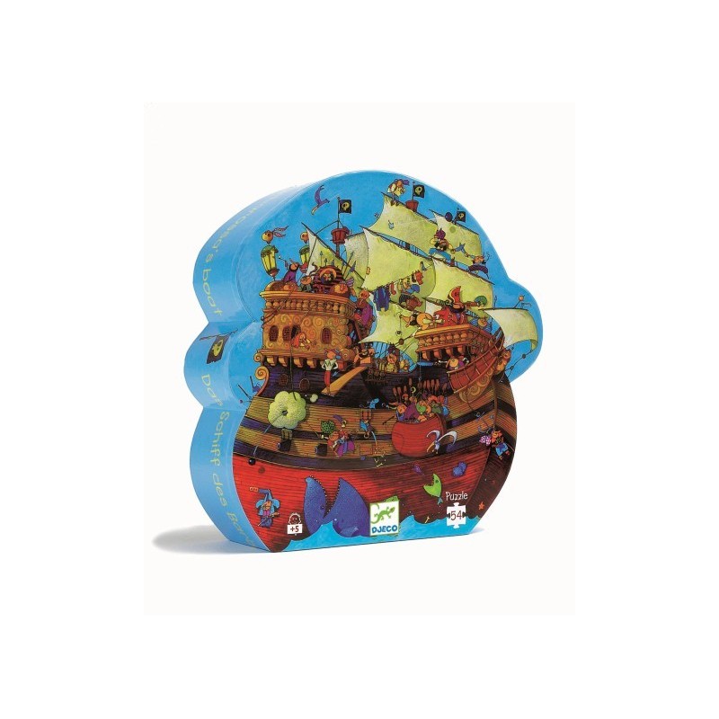 Subamos al barco de Barbarroja y vivamos la vida de un pirata. Un colorido puzle de 36 piezas en una elegante caja con forma de barco. Caja con silueta decorativa para la habitación del niño. Piezas grandes, fáciles de agarrar.
