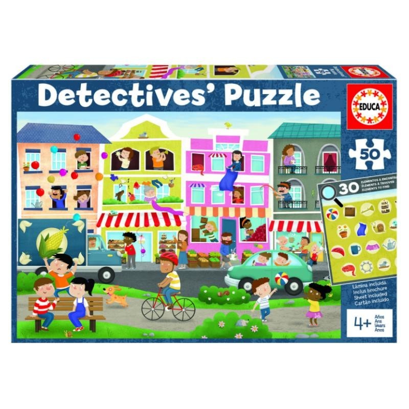 Puzzle de observación de 50 piezas. ¡Móntalo y encuentra los 30 elementos escondidos! Incluye una hoja a color con las ilustraciones de los 30 elementos a encontrar. Tamaño aproximado del puzzle montado: 40 x 28 cm. Temática: la ciudad.