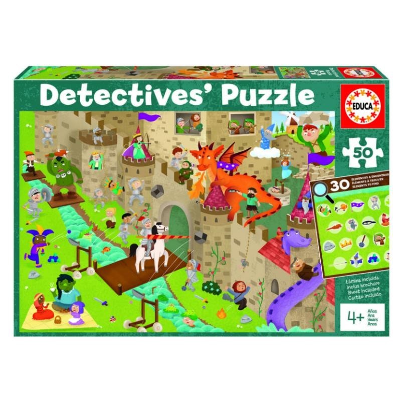 Puzzle de observación de 50 piezas. ¡Móntalo y encuentra los 30 elementos escondidos! Incluye una hoja a color con las ilustraciones de los 30 elementos a encontrar. Tamaño aproximado del puzzle montado: 40 x 28 cm. Temática: el castillo.