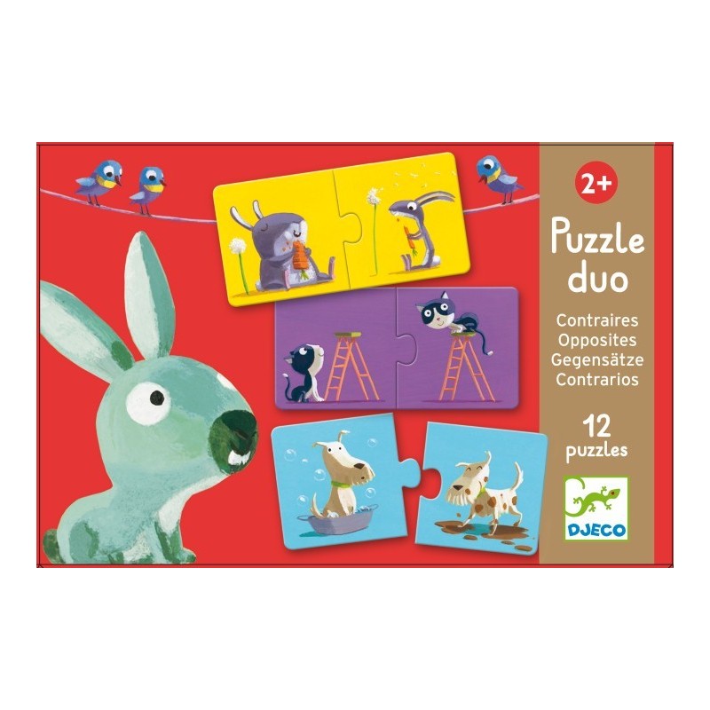 Puzzle Duo Contraires es un puzle lúdico en el que el niño asocia una imagen con su opuesta. Un primer juego de asociación sencillo y divertido. Ideal para entender las nociones de los opuestos.