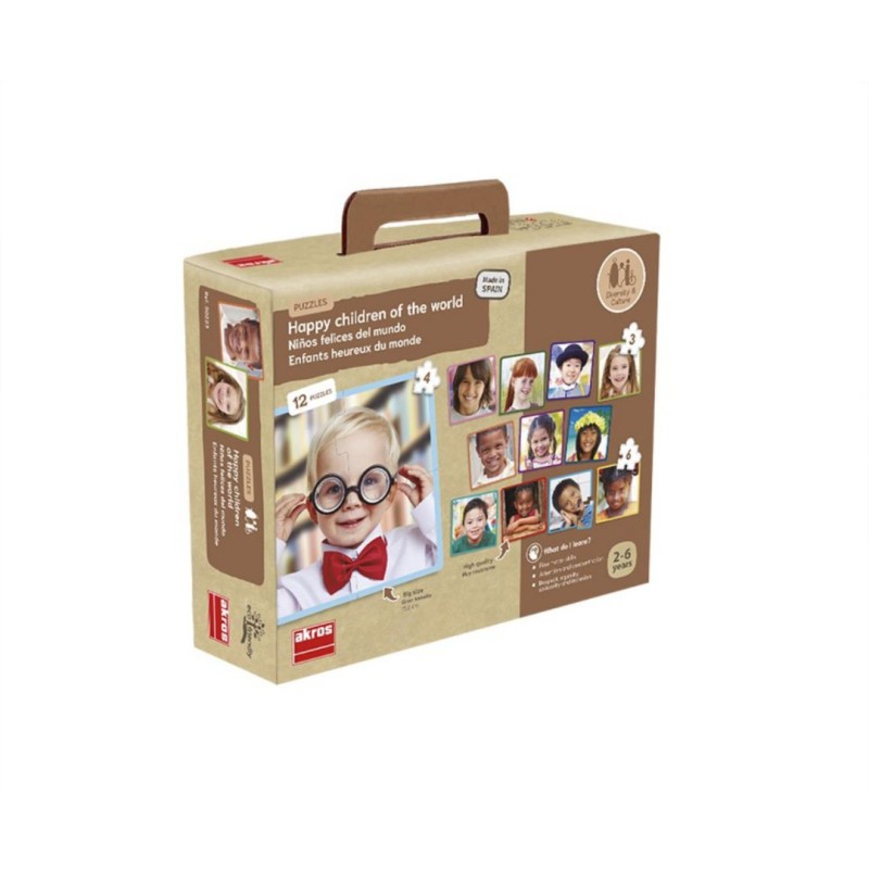 Set de 12 puzles progresivos de 3, 4 y 6 piezas, con imágenes de niños felices de todo el mundo. Realizados con piezas grandes en cartón grueso de máxima calidad y resistencia, para niños a partir de 2 años.