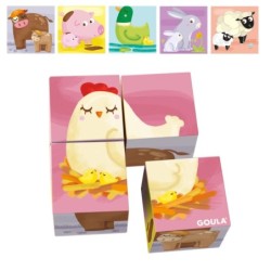 Puzzle cúbico formado por 4 cubos y con 6 ilustraciones. En las ilustraciones se muestra a mamás y bebés de animales de la granja: gallina, vaca, cerdo, pato, conejo y oveja. El color del fondo de la ilustración ayudará a los niños a formar el puzzle correctamente.