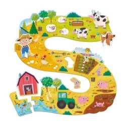 Gran puzle de cartón con 17 piezas y dos figuras para poder jugar con motivos de la granja. El puzle conforma una camino serpentead para que el niño se lo pase muy bien.