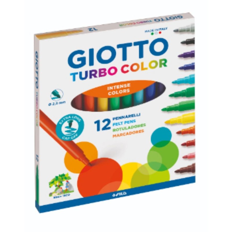 Cuando necesitas colorear, ¡los rotuladores Giotto Turbo Color siempre están preparados! Creado con unas tintas seguras base de agua, son lavables de la piel con agua y jabón y de muy larga duración. Se pueden eliminar de la ropa con un ciclo normal de lavado a 40ºC. Su punta de 2,8 mm. es súper resistente y está bloqueada para que nunca se hunda. Disponible en 36 brillantes e intensos colores. Con capuchón ventilado.