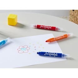 Rotuladores con sello: Amarillo – estrella, naranja – cara sonriente, rojo – labios, rosa – corazón, granate – música, verde oscuro – árbol, verde claro – dedos, azul claro – explosión, azul oscuro – símbolo ok, lila – interrogante, marrón – símbolo acierto, negro – pie.