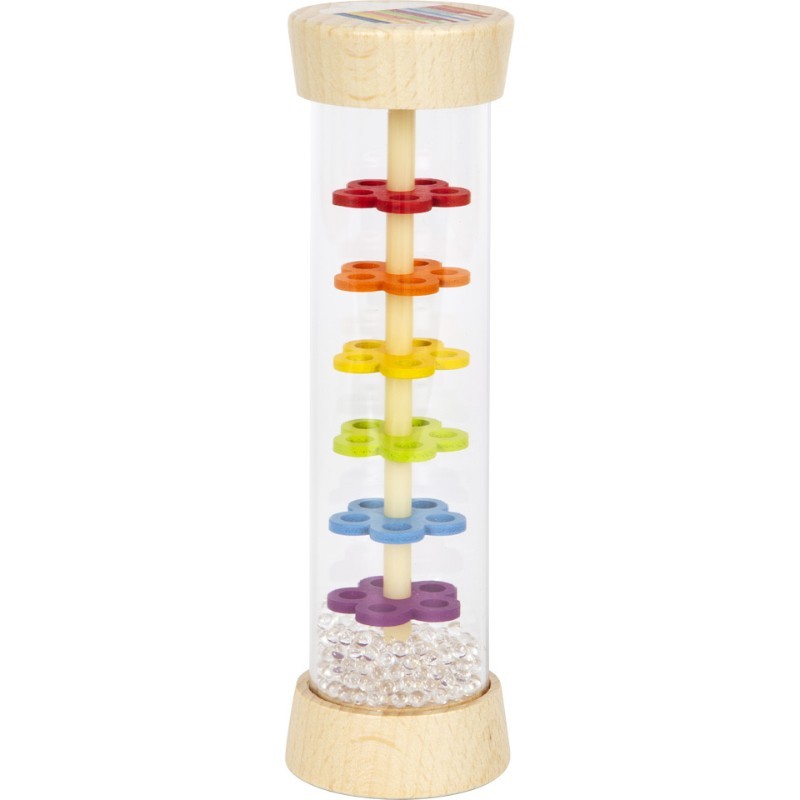 ¡Así es como suena la lluvia! Con esta barra se puede imitar los tonos suaves de la lluvia. Puede utilizarse como sonajero, instrumento rítmico, juguete sonoro o juego sensorial relajante que no sólo fascina a los niños. El émbolo de plástico transparente de la barra de lluvia proporciona una visión clara de las perlas de vidrio que se filtran a través de las seis placas perforadas de colores en forma de flores. La acústica y la percepción visual se entrenan de esta manera.