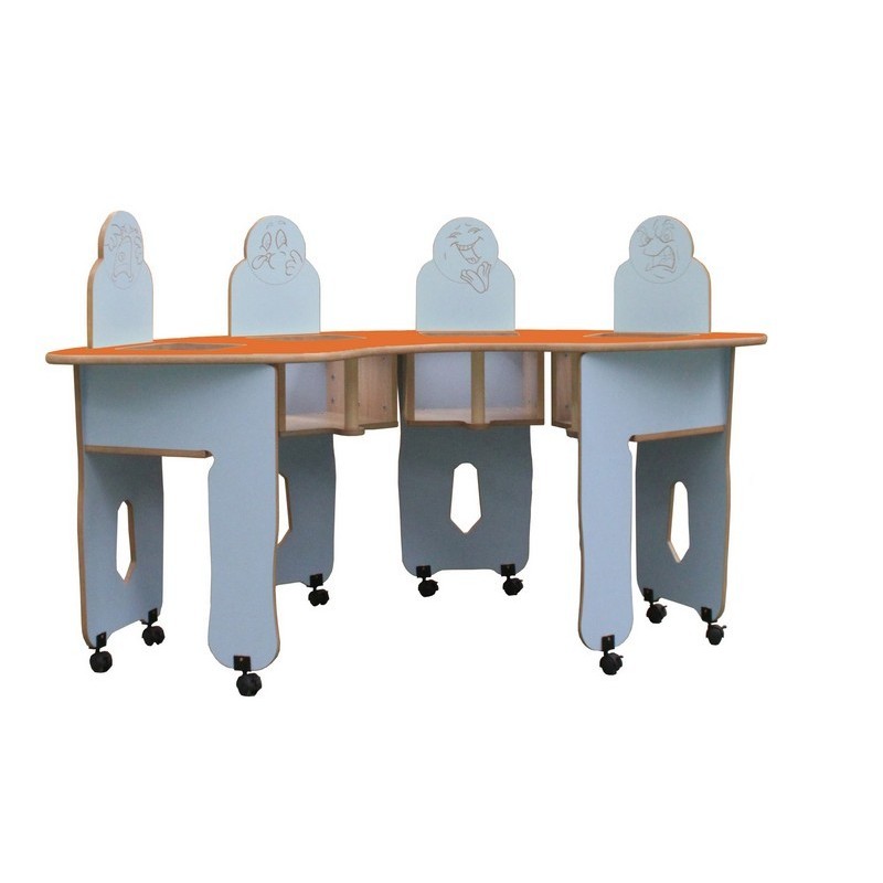 Mesa trona compuesta por una encimera en forma de arco fabricada en tablero MDF (DM) de 21 mm de espesor, con cantos redondeados barnizados con barniz no tóxico. Superficie y contratiro de la encimera laminados con planchas de alta presión (HPL), muy resistentes al desgaste. Dos costados y cuatro respaldos que ejercen la función de patas, fabricados en MDF (DM) de 16 mm de espesor, con cantos redondeados y barnizados con barniz no tóxico, incorporan ruedas en sus extremos inferiores para facilitar su desplazamiento. Cuatro bases para asientos con una barra de seguridad central para que no se caigan los niños/as. Opción de incorporar asientos acolchados con funda extraible de fácil limpieza.