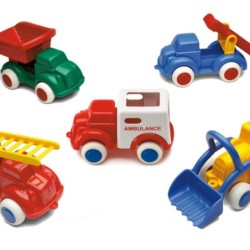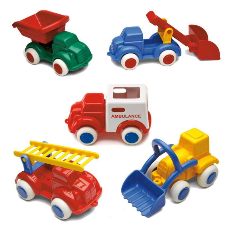 Conjunto de 18 vehículos de polipropileno flexible ideales para centros escolares y guarderías. 5 modelos. 14 cm.