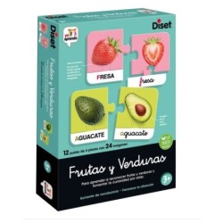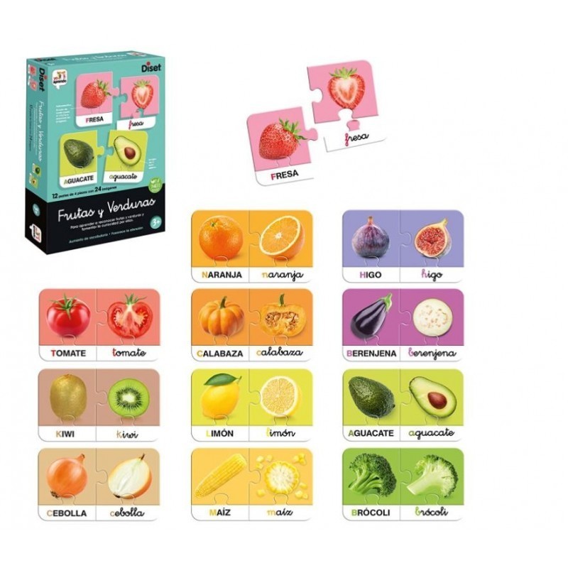 Juego educativo para niños a partir de 3 años para aprender a reconocer frutas y verduras y fomentar la curiosidad por ellas. El juego contiene 12 puzles de 4 piezas cada uno en el que se verá: