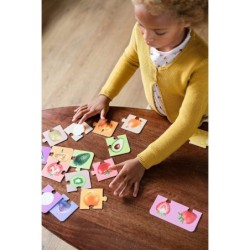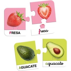 Los niños deberán emparejar las fichas del puzle fijándose en el exterior e interior de la fruta o verdura. El color del fondo de las fichas les servirá de guía para encontrar las parejas. Este código de color hace que el juego sea autocorrectivo.
